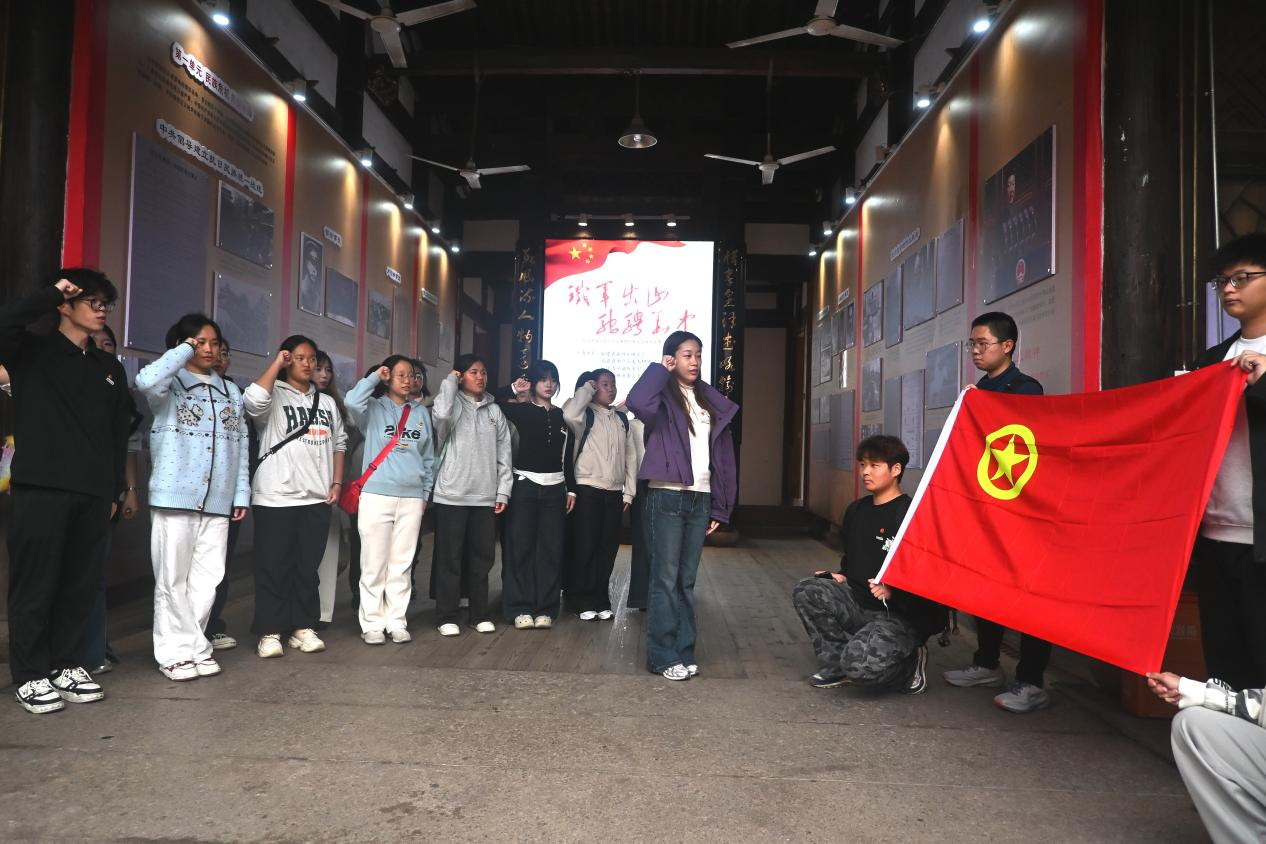 在新四军驻福州办事处旧址,学子们通过历史照片、文献档案与实物展品,系统了解了办事处自1938年成立后,在宣传抗日主张、巩固抗日民族统一战线、输送抗日力量等方面的卓越贡献。革命先辈的爱国主义精神、顽强斗争精神与视死如归的牺牲精神,成为学校“家国情怀教育”最生动的实景教材。参观尾声,学子们重温入团誓词,将思政课堂中习得的“人民至上”“民族大义”等理念转化为具象的誓言与行动,让青春理想与革命先辈的初心使命同频共振,真正实现学校思政教育“知行合一”的培养要求。