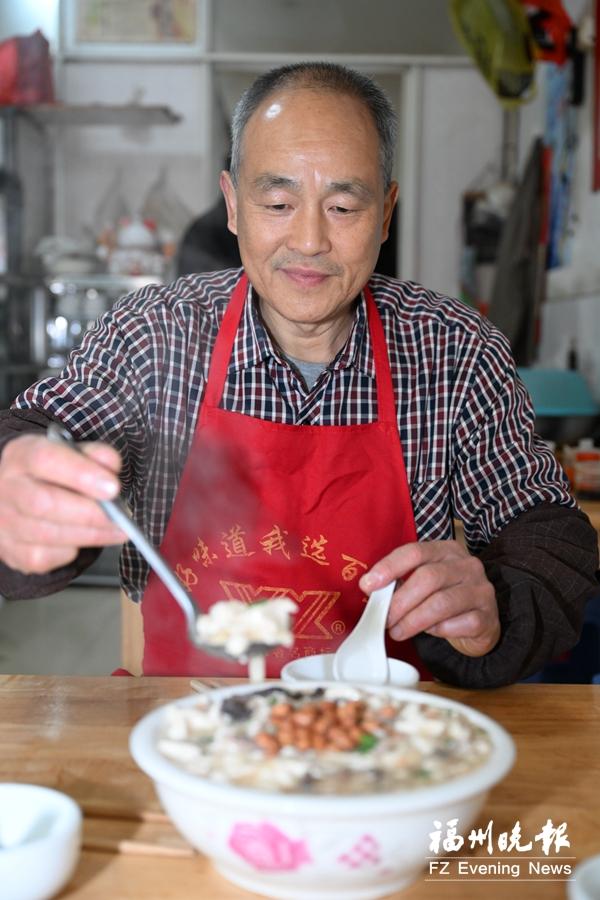吴海明介绍,池园炣豆腐始于清道光年间,由龙井吴氏先祖独创,将山珍海味融入一碗豆腐羹中,成为当地乡宴不可或缺的“头碗菜”。“过去这碗炣豆腐是待客的最高礼仪。”吴海明自幼在灶台旁看着祖辈制作炣豆腐,10多岁就掌握了它的制作技艺。2020年,池园炣豆腐制作技艺入选闽清县第四批非物质文化遗产名录。