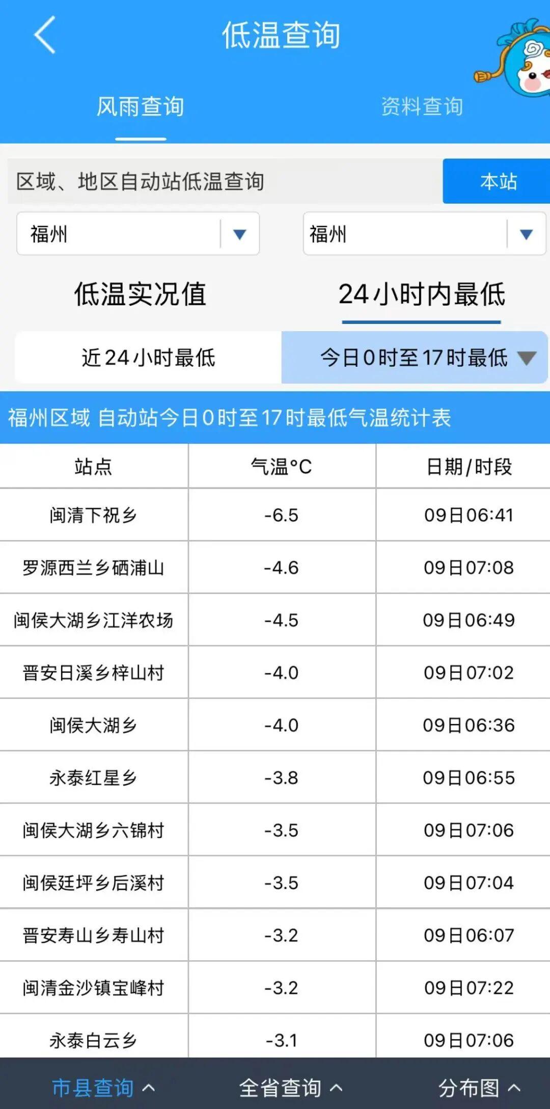 9日福州区域最低温出现在闽清下祝乡,只有-6℃。