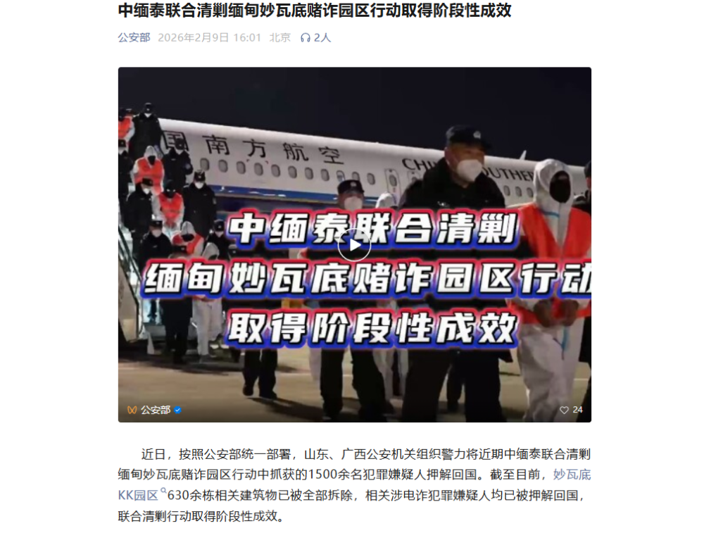 长期以来,缅甸妙瓦底地区盘踞着大量赌诈犯罪集团,大肆实施电信网络诈骗等犯罪活动,危害十分严重。2025年初,中缅泰建立联合打击电信网络诈骗犯罪部级协调机制,持续开展多轮打击行动。今年以来,公安部赴缅、泰工作组在我驻缅、驻泰使馆的大力支持下,与两国外交、移民、军警等相关部门开展多轮次磋商会谈,持续推动集中清剿工作,连续开展10次联合遣返行动,对犯罪分子形成强大震慑。