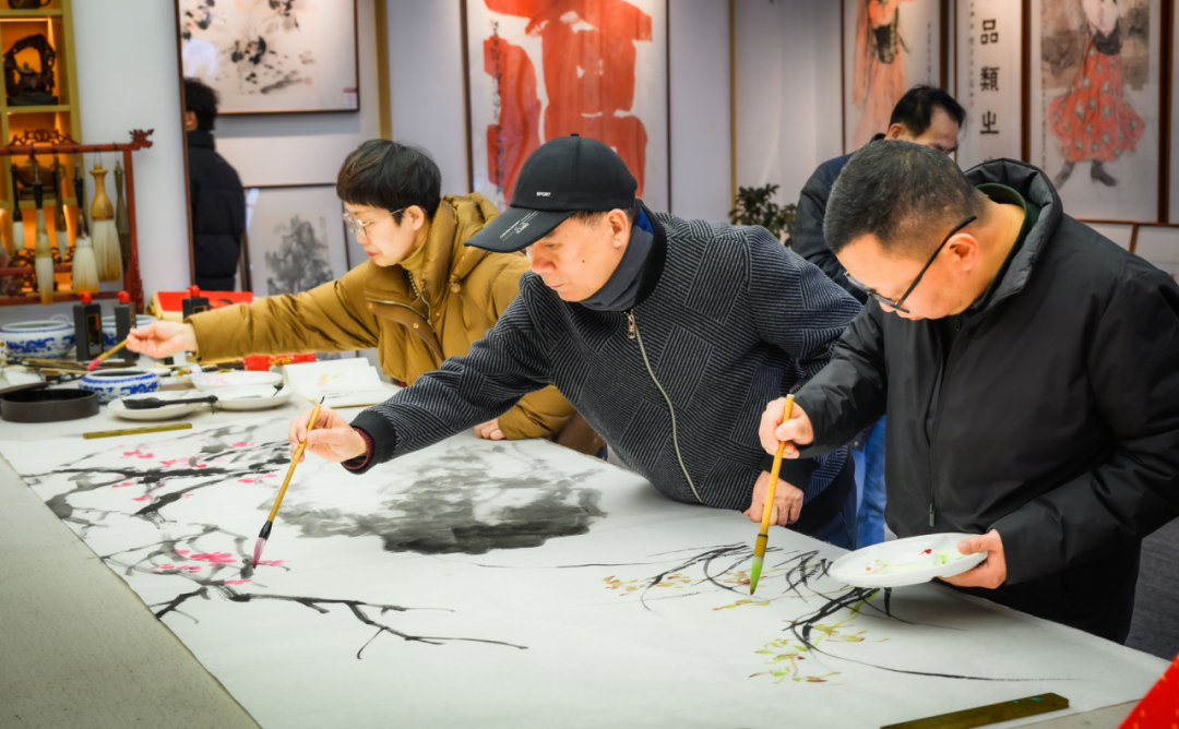 活动现场墨香四溢、暖意融融,红色宣纸整齐铺展,笔墨纸砚摆放有序,浓浓的年味与清雅的墨香交织在一起,省市著名书画家陈元邦、李大林、刘闽东、陈超星、陈锐等挥毫泼墨,笔走龙蛇间,一幅幅兼具艺术美感与美好寓意的书画作品相继诞生。五位书画家还为本次联谊会合绘了一幅花鸟书画作品“君子同风”,饱含着对新春佳节的美好祈愿,也寄托着对辖区企业蓬勃发展、瀛洲片区繁荣进步的殷切期许。