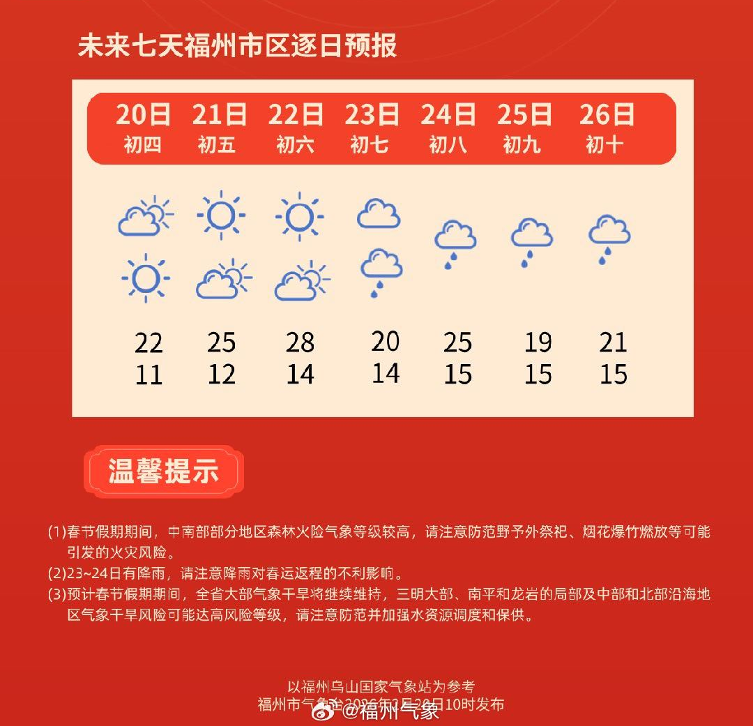 20日是大年初四,弱冷空气控制,福州全市各地天气晴到多云。白天全市大部地区,最高气温在20℃~24℃左右,体感舒适。
