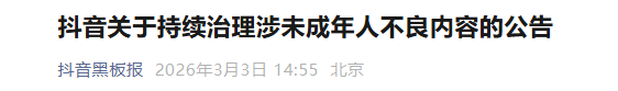 3月3日,抖音黑板报官方账号发布《抖音关于持续治理涉未成年人不良内容的公告》。