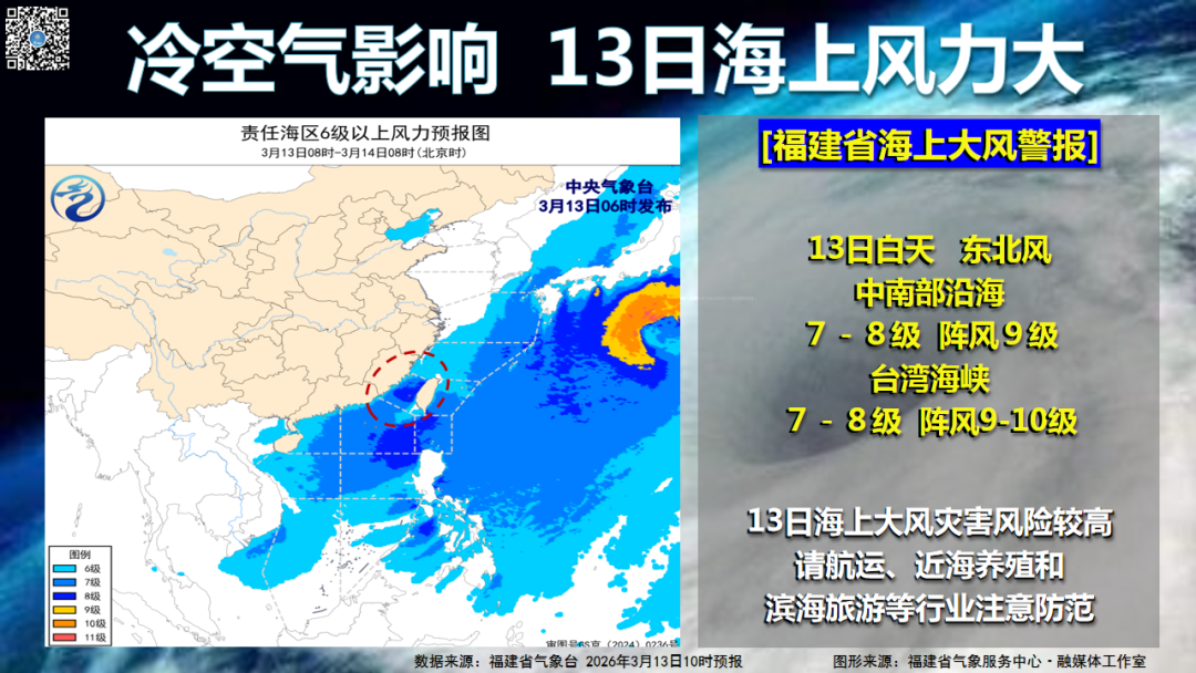 沿海大风方面,13日,中南部沿海海区有7~8级阵风9~10级东北大风,其余时段无平均风8级及以上大风。