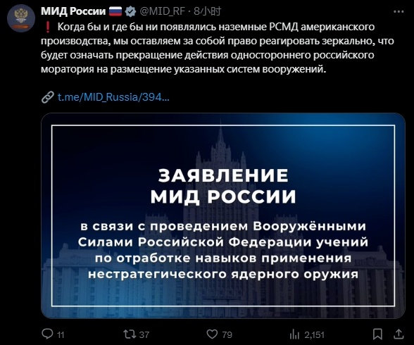 声明提到,近一段时间,美西方国家持续援乌武器并公开宣布支持乌克兰袭击俄领土的"恐怖主义行为",包括英法提供的远程导弹、美国提供的可以打击俄领土的ATACMS系列导弹,"对俄罗斯国家安全构成额外威胁"。美国还通过在世界各地部署中程陆基导弹系统,增加了对俄罗斯的"多方面导弹威胁"。