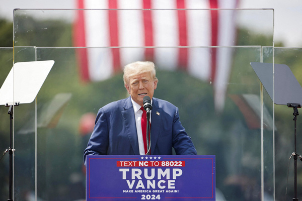 当地时间2024年8月21日,美国北卡罗来纳州,美国前总统特朗普与竞选搭档万斯在户外举行竞选集会,讲台上加装防弹玻璃保护。 澎湃影像