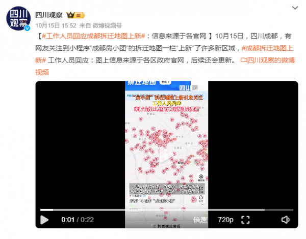 据四川广播电视台《四川观察》15日报道,成都有网友关注到小程序"成都房小团"的拆迁地图一栏"上新"了许多新区域,工作人员回应称图上信息来源于各区政府官网,后续还会更新。