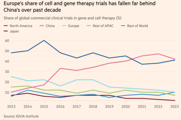 欧洲在全球CGT商业临床试验中所占的份额远远落后于中国 FT