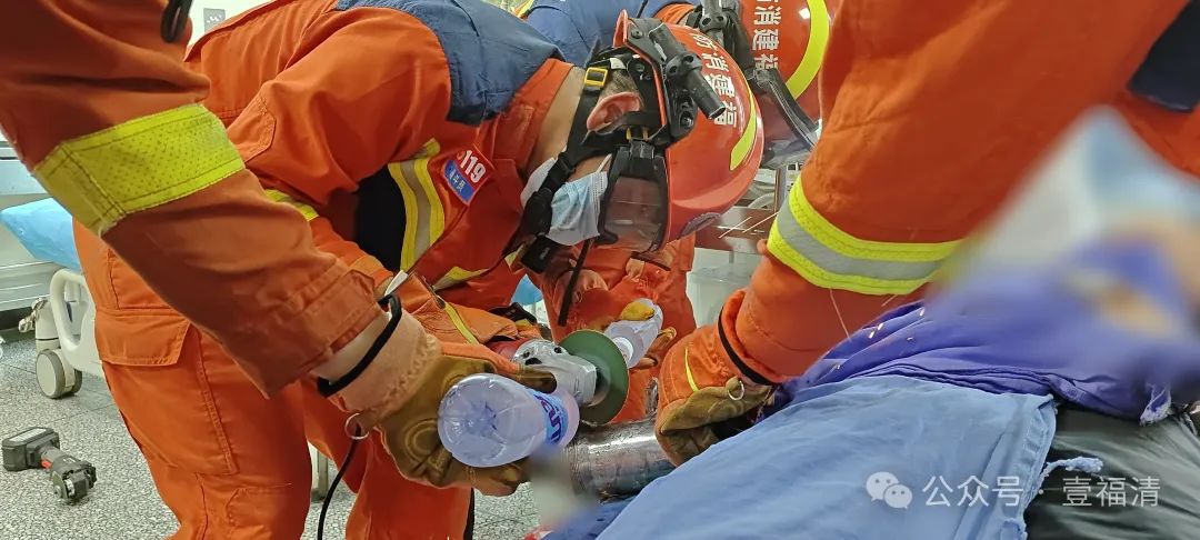 根据被卡住的位置,消防救援人员先用角磨机将绞肉机上部切割出一个“L”形的裂缝,同时用冷水对绞肉机被切割处进行冷却,防止切割发热对受伤部位造成二次伤害。切割完成后,救援人员使用液压扩张器对绞肉机切割处进行扩张,扩大救援空间。