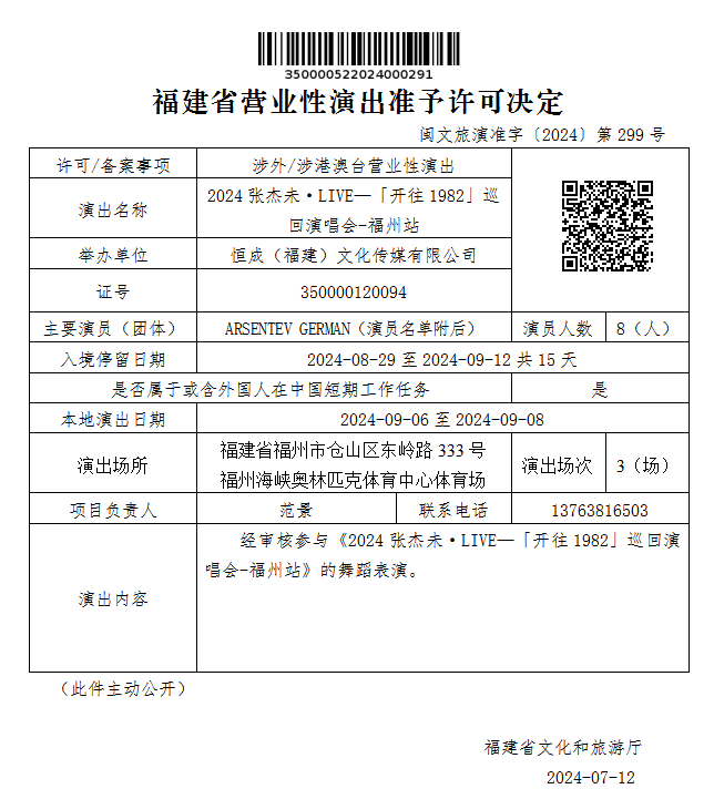 定了!3场!2024年9月6日—8日,张杰将在福州开演唱会!演出场所位于福州海峡奥林匹克体育中心体育场。