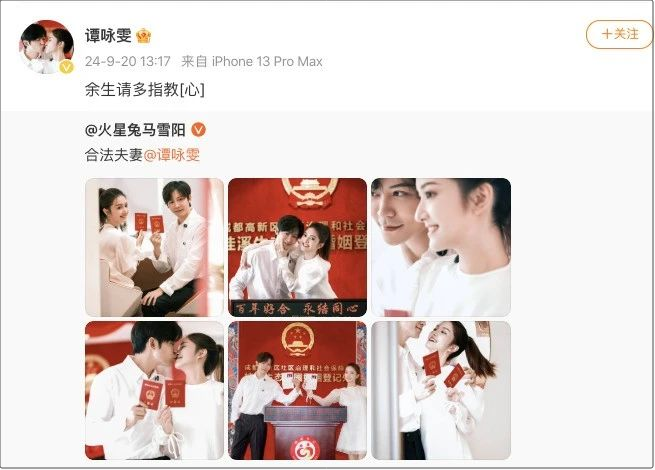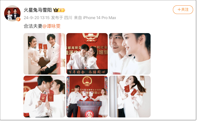 9月20日,中国内地男子流行演唱组合至上励合成员马雪阳官宣与演员谭咏雯结婚喜讯,两人晒出领证照片,甜蜜接吻,写道“合法夫妻”“余生请多指教”。