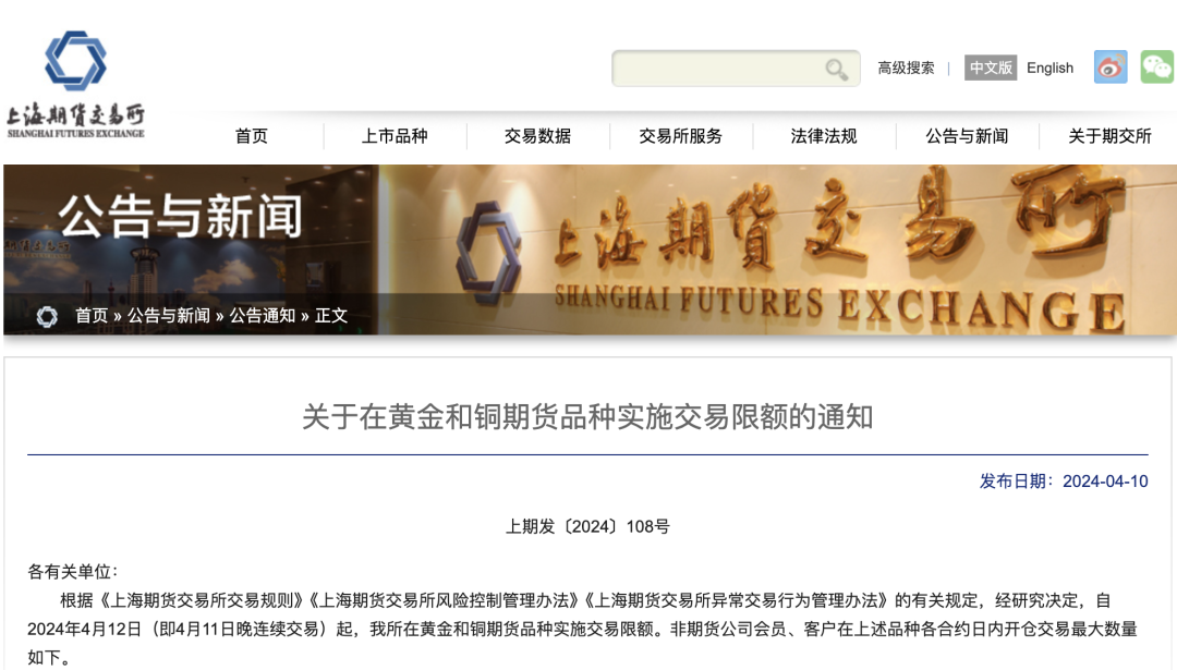 4月10日,上海期货交易所发布《关于在黄金和铜期货品种实施交易限额的通知》。