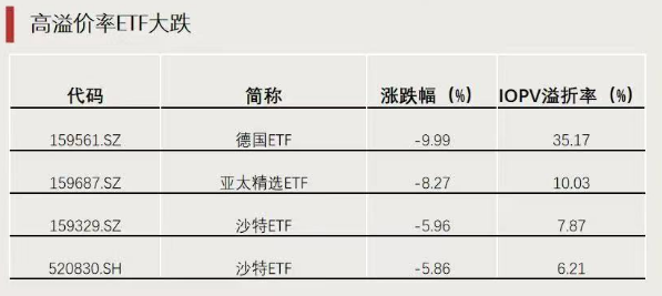 跨境ETF今日延续大跌。截至收盘,德国ETF跌停,亚太精选ETF、沙特ETF等大幅下挫。