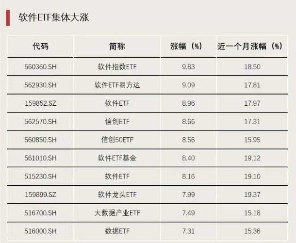 DeepSeek概念今天大爆发。哪些基金受益?从ETF表现来看,软件、信创、云计算、游戏、人工智能等ETF集体大涨。截至收盘,软件指数ETF、软件ETF易方达涨超9%,信创ETF、信创50ETF等涨超8%。
