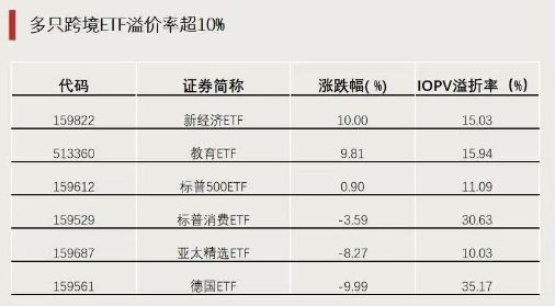 不过,仍有多只跨境ETF溢价率高企。2月5日,新经济ETF、教育ETF大涨,溢价率超过15%。