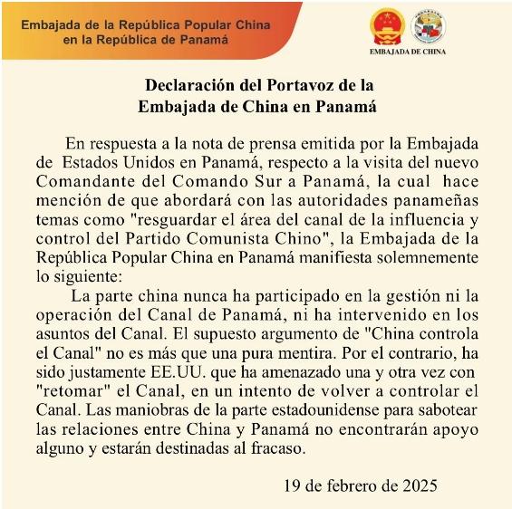 据中国驻巴拿马大使馆微信公众号消息,针对美国驻巴拿马使馆关于新任南方司令部司令访问巴拿马的新闻稿中提及“将同巴方官员探讨‘避免运河区受到中国共产党的影响和控制’”,中国驻巴拿马使馆严正声明如下: