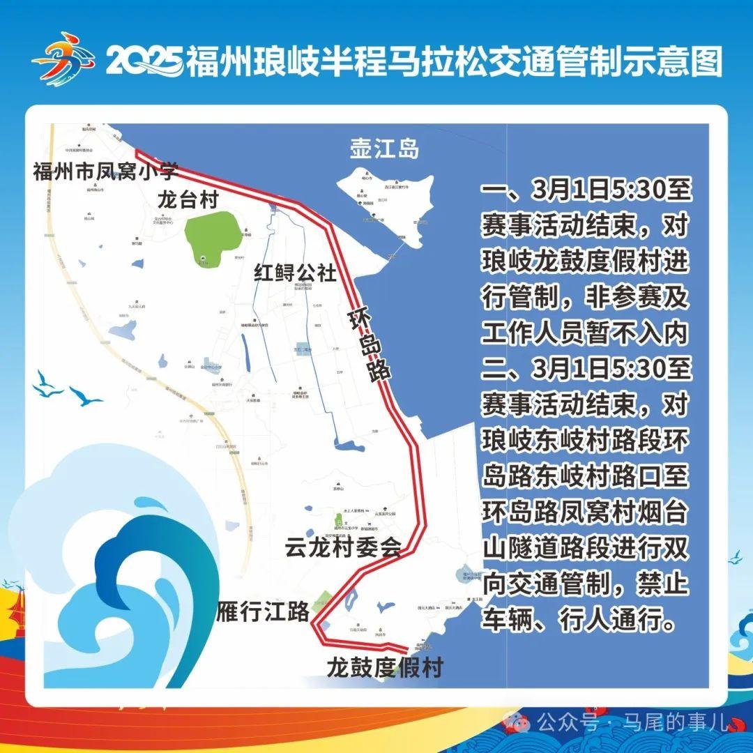2025年3月1日,福州市马尾区琅岐镇东岐村路段至环岛路凤窝村路段将举行“2025福州琅岐半程马拉松赛”,为确保活动期间周边道路交通安全顺畅,根据《中华人民共和国道路交通安全法》第三十九条规定,决定2025年3月1日对赛事周边部分道路实行临时交通管制。现通告如下: