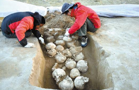 1965年,在陕西省绥德县义合乡墕头村出土了一批商代晚期青铜器,有鼎、䍌、壶、爵、觚、锛、凿、刀、匕、戈等,器形与商晚期基本相同,但具有明显的游牧民族特点。