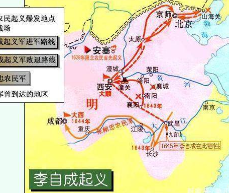 后来的事情就很清楚了,李自成在陕西后部队很快壮大,后来号称百万。兵分两路进军北京,一路自陕西经山西进北京,一路经陕西到河南再进北京,最后两路兵马攻入北京,崇祯上吊自杀。后来,明山海关总兵吴三桂引清兵入关,两军联合灭了李自成军队,李自成逃回北京,又逃到西安,再从西安逃到湖北,于1645年5月死于湖北九宫山。