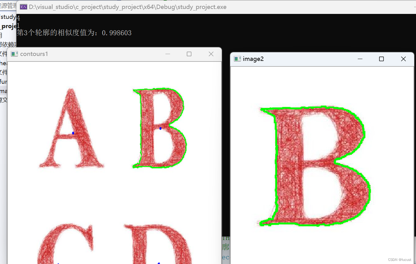 {vector> contours1;vector> contours2;contour_get(image1, contours1);contour_get(image2, contours2);/** 步骤:* 1、任选图像2中的一个轮廓,计算其Hu矩* 2、对图像1所有轮廓计算Hu矩,将图像2的Hu矩与图像1的所有Hu进行比较* 3、相似度阈值操作。*///Hu矩计算Moments mm2 = moments(contours2[0]);//先计算几何矩Mat hu2;HuMoments(mm2, hu2);for (size_t t = 0; t < contours1.size(); ++t) {Moments mm = moments(contours1[t]);//先计算几何矩Mat hu;HuMoments(mm, hu);double sim_value = matchShapes(hu, hu2, CONTOURS_MATCH_I1, 0);//在原图绘制相似轮廓if (sim_value < 1) {cout << "第" << t << "个轮廓的相似度值为:" << (float)(1 - sim_value) << endl;drawContours(image1, contours1, t, Scalar(0, 255, 0), 2, 8);drawContours(image2, contours2, 0, Scalar(0, 255, 0), 2, 8);}//获取图像1轮廓的中心位置double cx = mm.m10 / mm.m00;double cy = mm.m01 / mm.m00;circle(image1, Point(cx, cy), 2, Scalar(255, 0, 0), 2, 8);//在中心位置画圆}namedWindow("contours1", WINDOW_FREERATIO);imshow("contours1", image1);namedWindow("image2", WINDOW_FREERATIO);imshow("image2", image2);