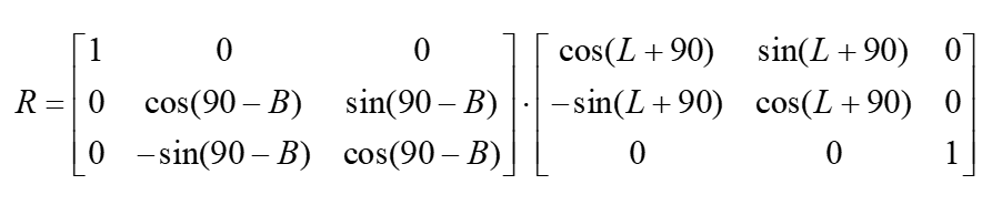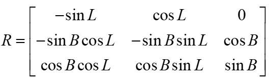 为测站在地固坐标系中的坐标向量;为卫星在站心坐标系中的坐标向量;R为旋转矩阵,即: