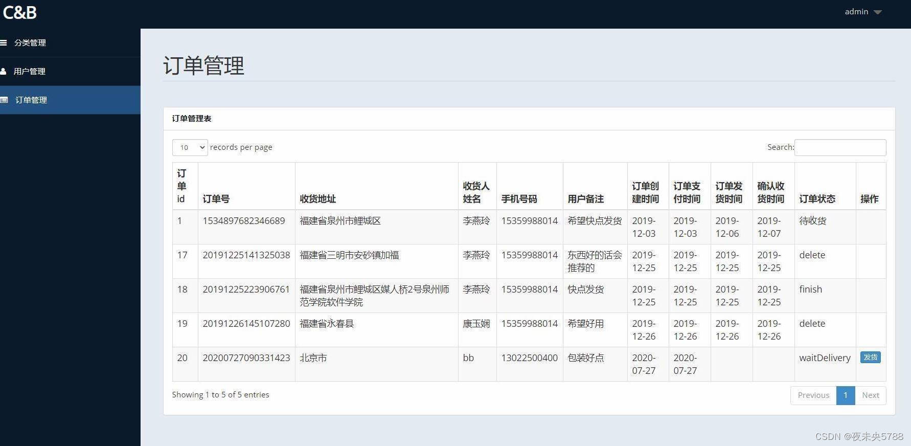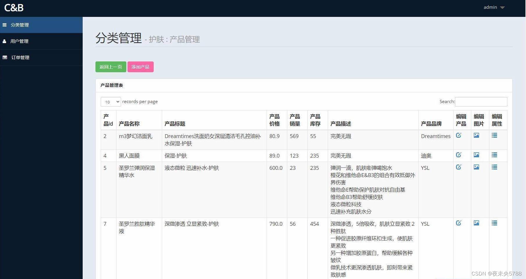 管理员登录,分类管理,产品管理,用户管理,订单管理等功能。
