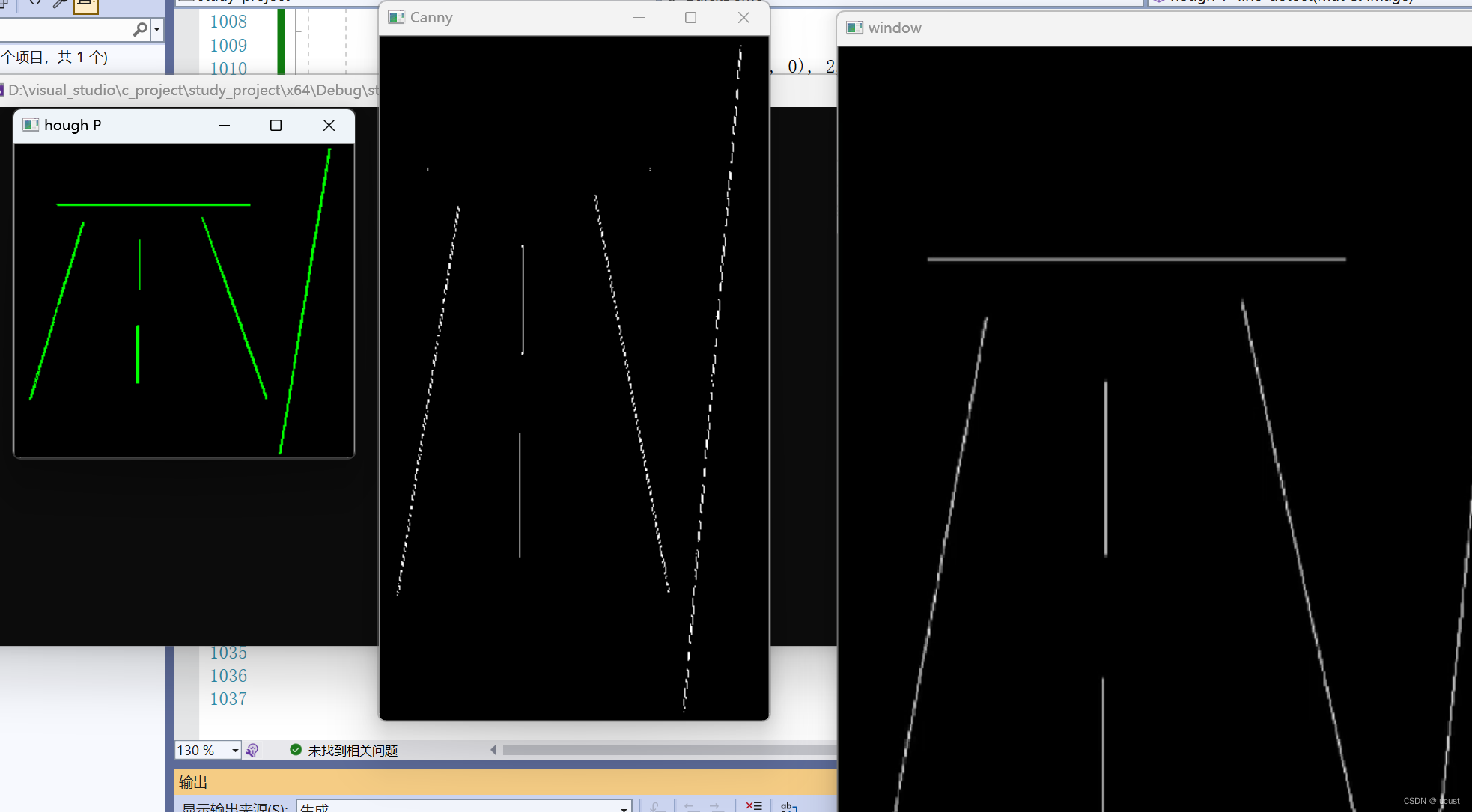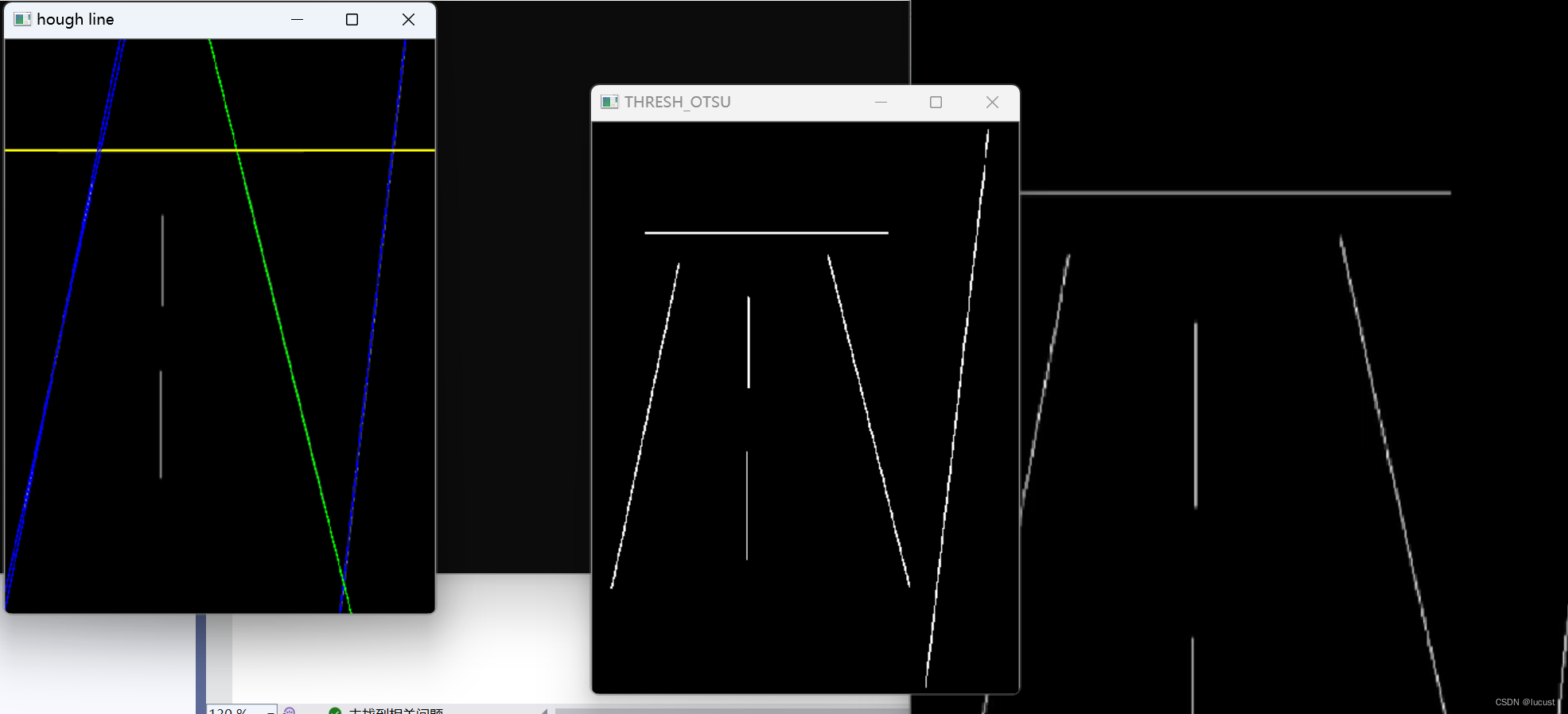 {Mat gray, binary;cvtColor(image, gray, COLOR_BGR2GRAY);Canny(gray, binary, 80, 160, 3, false);namedWindow("Canny", WINDOW_FREERATIO);imshow("Canny", binary);vector lines;HoughLinesP(binary, lines, 1, CV_PI / 180.0, 80, 30, 10);Mat result = Mat::zeros(image.size(), image.type());for (int i = 0; i < lines.size(); ++i) {line(result, Point(lines[i][0], lines[i][1]), Point(lines[i][2], lines[i][3]), Scalar(0, 255, 0),2, 8);}namedWindow("hough P", WINDOW_FREERATIO);imshow("hough P", result);}