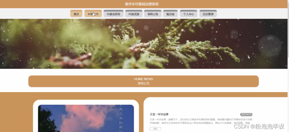 数字乡村基础治理系统,在系统首页可查看首页、村务公开、村委会排班、村里资源、系统公告、留言板、个人中心、后台管理等内容,如图4-16所示。