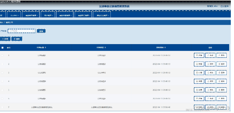 通知公告管理;在通知公告管理页面中可以查看 索引,公告标题,公告类型,发布时间等内容,并进行详情,修改和删除操作;如图5-7所示。