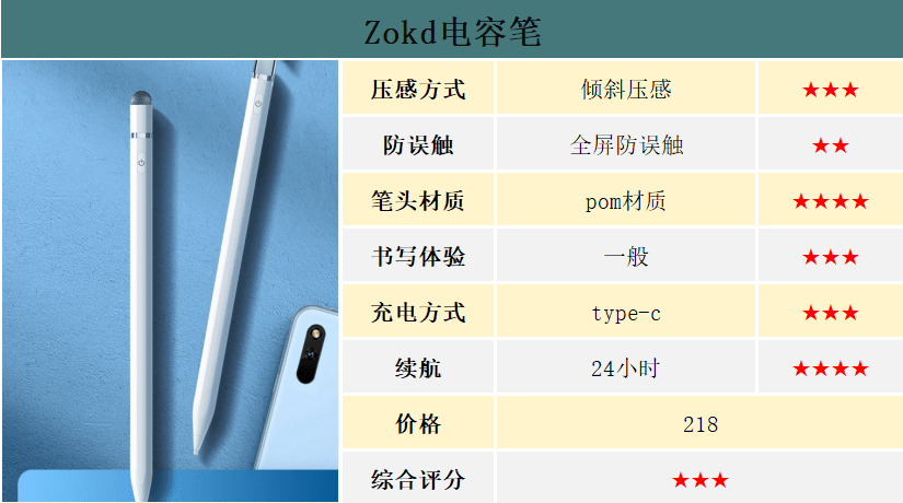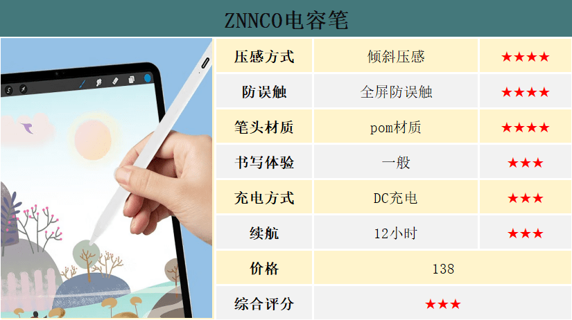 ZNNCO电容笔上方有一盏能实时显示剩余电量的指示灯;采用的是POM材质的笔尖,经久耐用,就算持续使用一天不会有压力;不打滑,线条粗细由您掌控,全屏防误触,还原纸张上的书写感受;充电一小时即可把电量充满,同时支持快速充电,续航时间为1个小时。