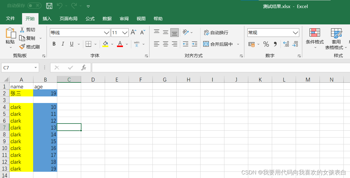 public static void main(String[] args) {JSONArray jsonArray = new JSONArray();for (int i = 0; i < 10; i++) {JSONObject jsonObject = new JSONObject();jsonObject.put("name","clark");jsonObject.put("age",i+10);jsonArray.add(jsonObject);}//读取模板try {FileInputStream inputStream =new FileInputStream("C:\\Users\\shiao\\Desktop\\测试.xlsx");XSSFWorkbook workbook = new XSSFWorkbook(inputStream);XSSFSheet sheet = workbook.getSheetAt(0);//获取表中的第一个sheetXSSFRow row = sheet.getRow(1);XSSFCell cell = row.getCell(0);//姓名的样式XSSFCellStyle nameStyle = cell.getCellStyle();System.out.println(cell.getStringCellValue());//字符串用string//年龄的样式cell= row.getCell(1);XSSFCellStyle ageStyle = cell.getCellStyle();System.out.println(cell.getRawValue());//数字用rawValue//获取后进行遍历数据库for (int i = 0; i < jsonArray.size(); i++) {JSONObject jsonObject = jsonArray.getJSONObject(i);//新增行XSSFRow rowNew = sheet.createRow(3+i);//参数代表从第几行新增//给新增行增加样式XSSFCell cellName = rowNew.createCell(0);//第1列,代表name的位置XSSFCell cellAge = rowNew.createCell(1);//第2列,代表age的位置cellName.setCellStyle(nameStyle);cellAge.setCellStyle(ageStyle);cellName.setCellValue(jsonObject.getString("name"));cellAge.setCellValue(jsonObject.getInteger("age"));}workbook.write(new FileOutputStream("C:\\Users\\shiao\\Desktop\\测试结果.xlsx"));} catch (FileNotFoundException e) {e.printStackTrace();} catch (IOException e) {e.printStackTrace();}