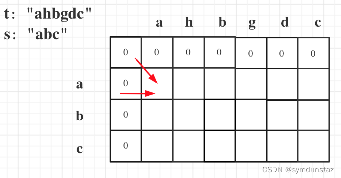 dp[i][j] 表示以下标i-1为结尾的字符串s,和以下标j-1为结尾的字符串t,相同子序列的长度为dp[i][j]