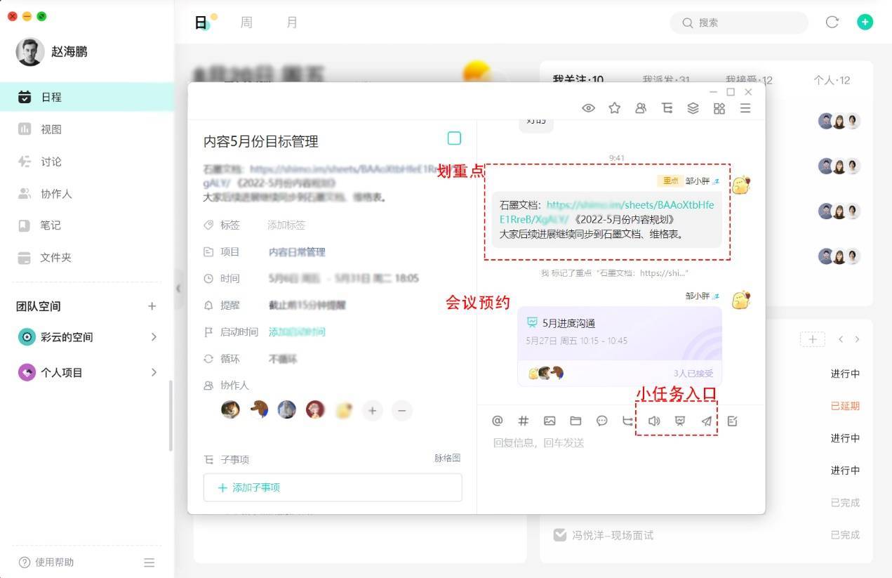 飞项IM在沟通上做了很多人性化的设置,每个事项都拥有专属的IM可以在事项内继续发起待办、会议等小任务,也可以给沟通内容标记重点,这样,沟通到哪里随时发起待办和会议,能解决的事情可以马上处理,以免下线后又晕头转向忘记要做的事。
