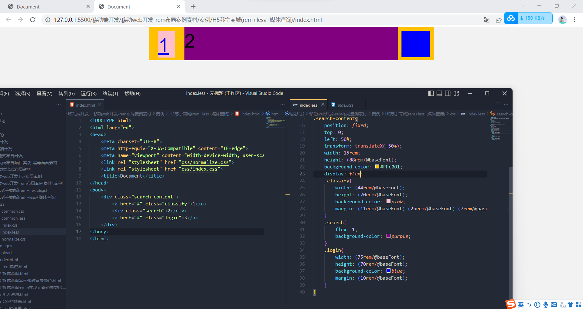 4. 因为我们pc端也可以打开我们苏宁移动端首页,我们默认html字体大小为 50px,注意这句话写到最上面