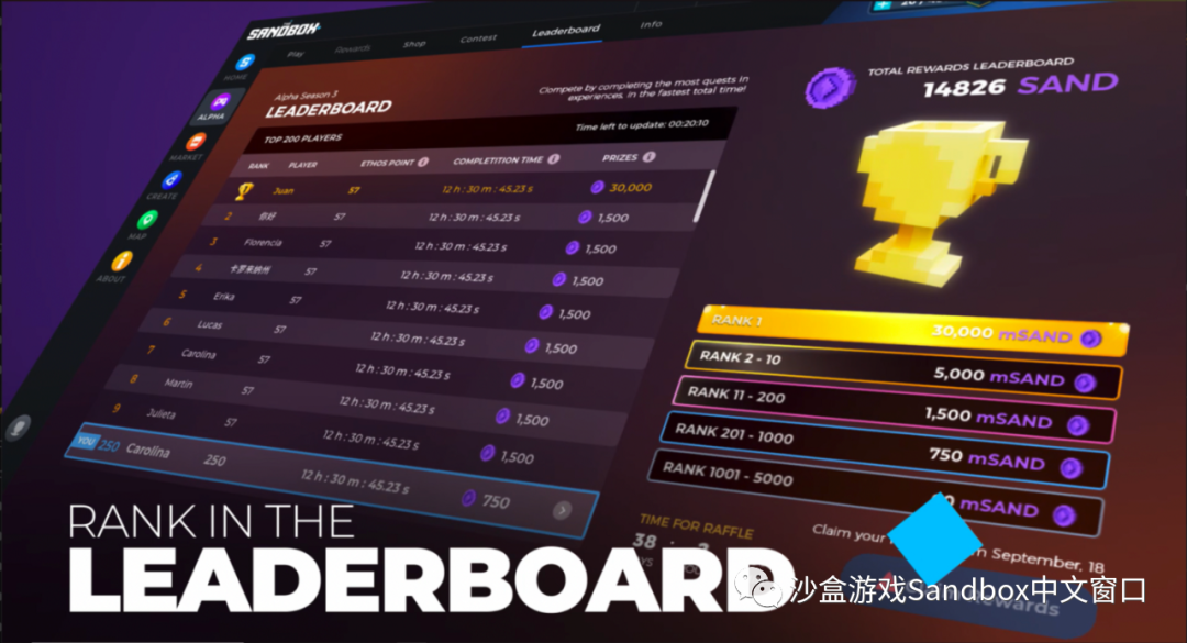 没能进入前十名吗?可以在这里找到全部 10,000 名获奖者名单:https://www.sandbox.game/en/season/leaderboard/