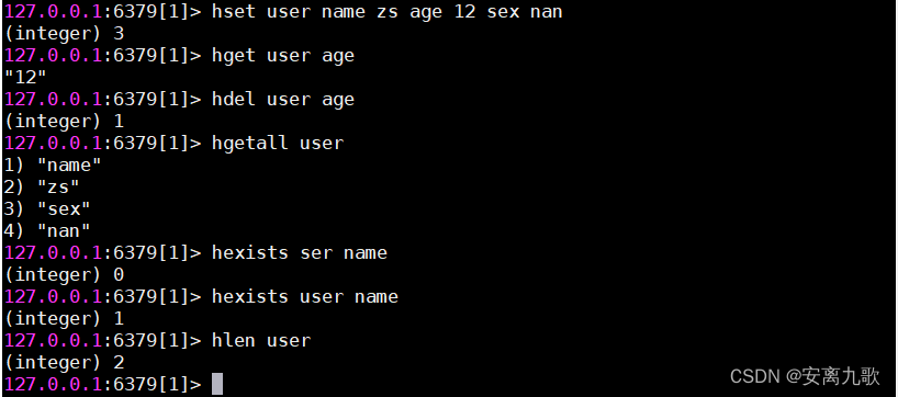 hset user name zs age 12 sex nv# hget key field #获取指定的字段值