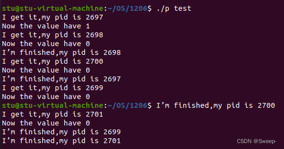 {printf("I get it,my pid is %d\n",pid);sem_getvalue(sem,&val);printf("Now the value have %d\n",val);