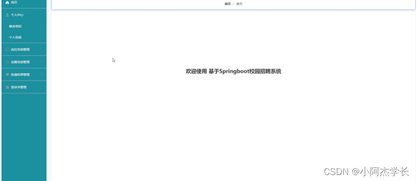 管理员登录系统后,可以对首页、个人中心、毕业生管理、企业管理、岗位类型管理、岗位信息管理、应聘信息管理、投递结果管理、系统管理等功能模块进行相应操作,如图4-5所示。