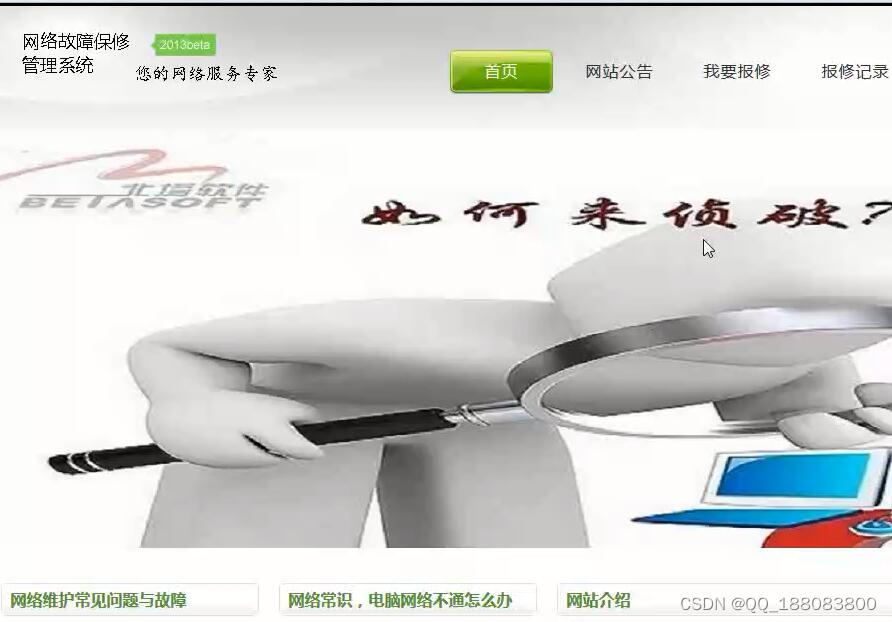 随着计算机和网络技术的迅猛发展,人们生活的信息化发展也得到了长足的进步,一个区域是否具有一流的信息管理、教育教学的平台已经是衡量一个地方信息化建设的重要标志之一。本系统分为两大模块:前台故障报修模块和系统管理模块。其中系统管理模块是进行员工管理、注册用户管理、报修单管理和维修单管理,是系统运行的基础。前台报修模块是客户端用户通过自己的用户名和密码登陆系统,进入界面后按照流程进行网络故障报修。该系统能有效减轻管理人员工作负担、提高工作效率、优化学生故障报修的流程,可节省大量人力财力和时间。