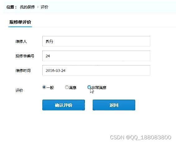 (3)我的报修:对已经完成的保修订单进行评价,已完成的订单包括:报修编号,报修人,维修人信息,评价