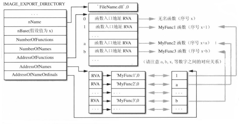 上面的_IMAGE_EXPORT_DIRECTORY 结构如果总结成一张图,如下所示: