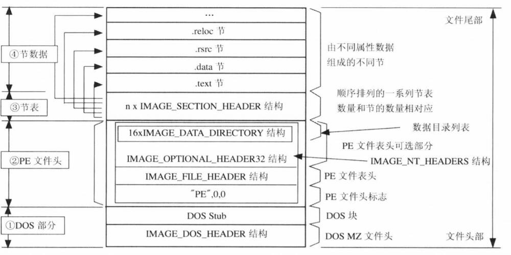 Windows NT 系统中可执行文件使用微软设计的新的文件格式,也就是至今还在使用的PE格式,PE文件的基本结构如下图所示: