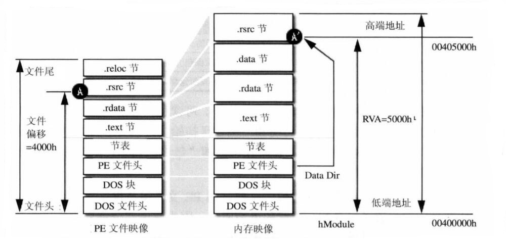 实际上当PE文件被装载入内存后,内存中的映像会被Windows修正为如下图所示的样子: