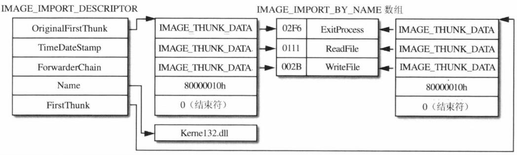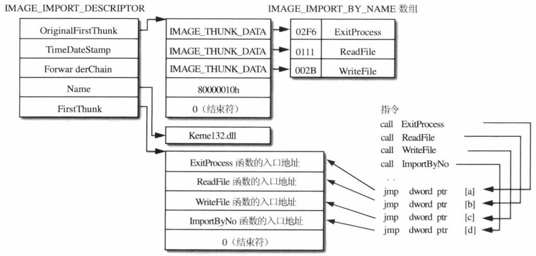其中由FristThunk字段指向的那个数组中的每个双字都被替换成了真正的函数入口地址,之所以在PE文件中使用两份IMAGE_THUNK_DATA数组的拷贝并修改其中的一份,是为了最后还可以留下一份备份数据用来反过来查询地址所对应的导入函数名。