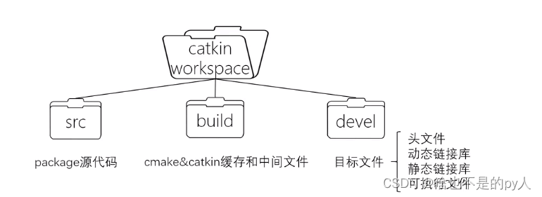 Catkin(中文意思为柳絮))是ROS定制的编译构建系统,是对CMake的扩展。Catkin Workspace则是组织和管理package的文件夹,组织结构如下所示。