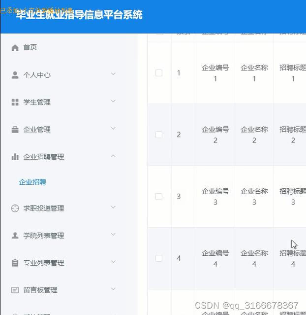 毕业生就业招聘求职信息系统。本毕业生就业指导信息平台系统主要包括登录管理员模块如下:首页、个人中心、学生管理、企业管理、企业招聘管理、求职投递管理、学院列表管理、专业列表管理、留言板管理、系统管理。企业模块;首页、个人中心、企业招聘管理、求职投递管理,学生模块:首页、个人中心、求职投递管理、我的收藏管理,前台首页;首页、企业招聘、网站资讯、留言反馈、个人中心、后台管理等多个模块。