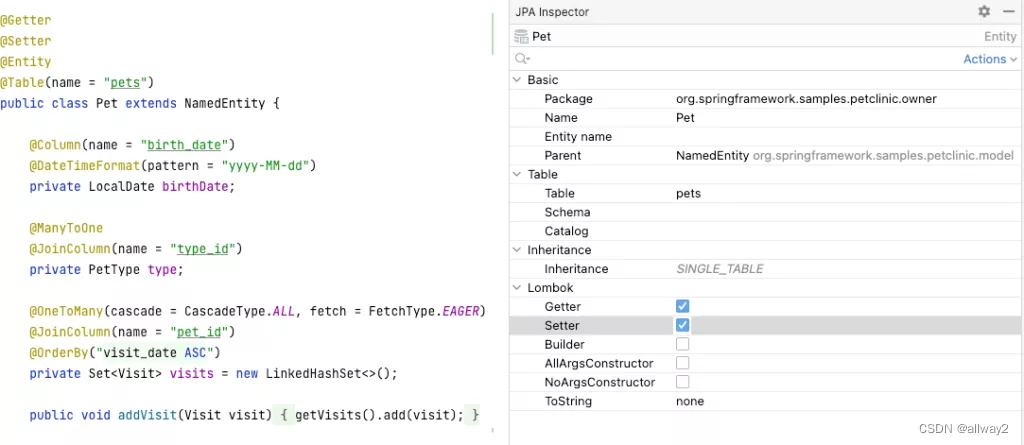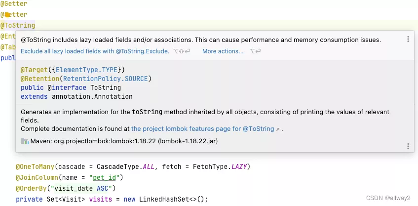 插件功能不仅限于检查和编辑。支持的重要部分是检查。某些龙目岛注释在与 JPA 一起使用时可能会导致性能问题或意外错误。例如,使用@ToString注可能会导致LazyInitException,因为它使用对象字符串表示形式的所有属性,包括惰性属性。
