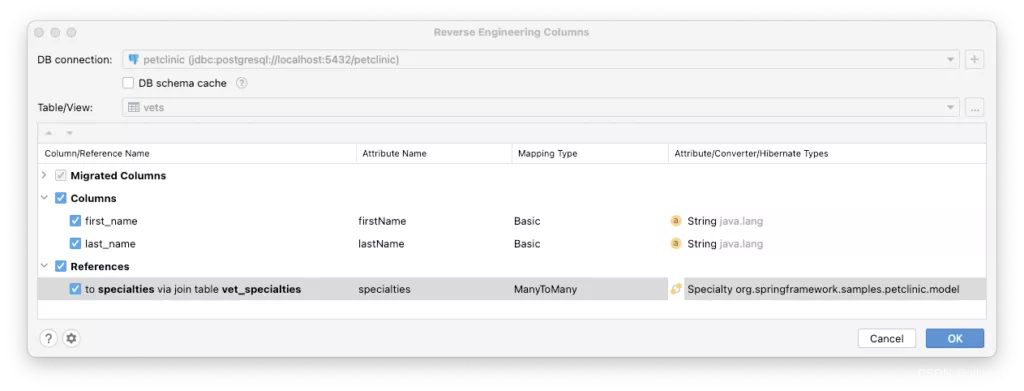数据通常比代码更长久,因此当我们在现有数据库上构建 JPA 数据层时,我们需要基于当前表创建 JPA 实体。JPA Buddy 提供了此功能,并允许开发人员以“挑选”的方式创建实体,逐个选择表: