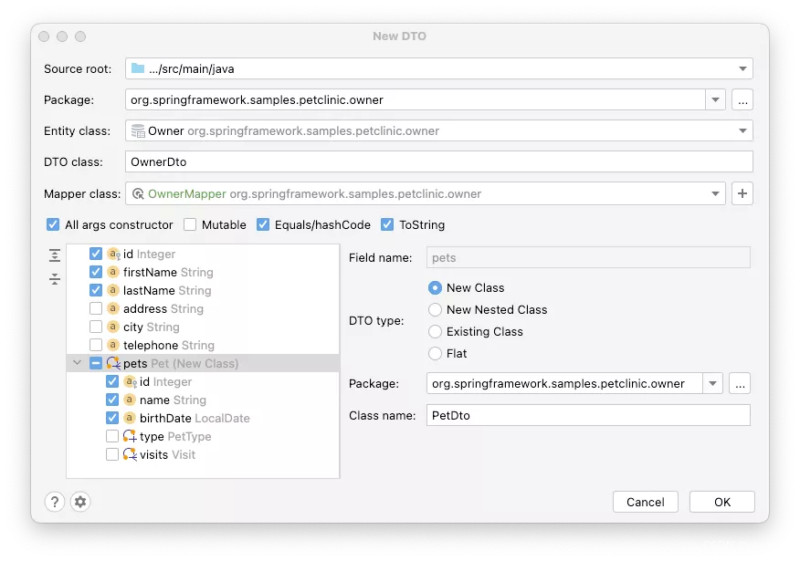 该插件生成 DTO 和映射器,包括关联的正确映射。JPA Buddy在这种情况下也支持龙目岛,并为DTO生成适当的注释: