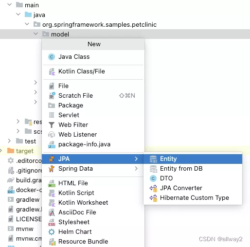 通常,应用程序开发从数据模型开始。JPA Buddy 提供了一个可视化设计器和组件面板,允许我们创建一个实体并向其添加基本属性和关联。我们可以从上下文菜单或 JPA 结构工具窗口调用相应的操作: